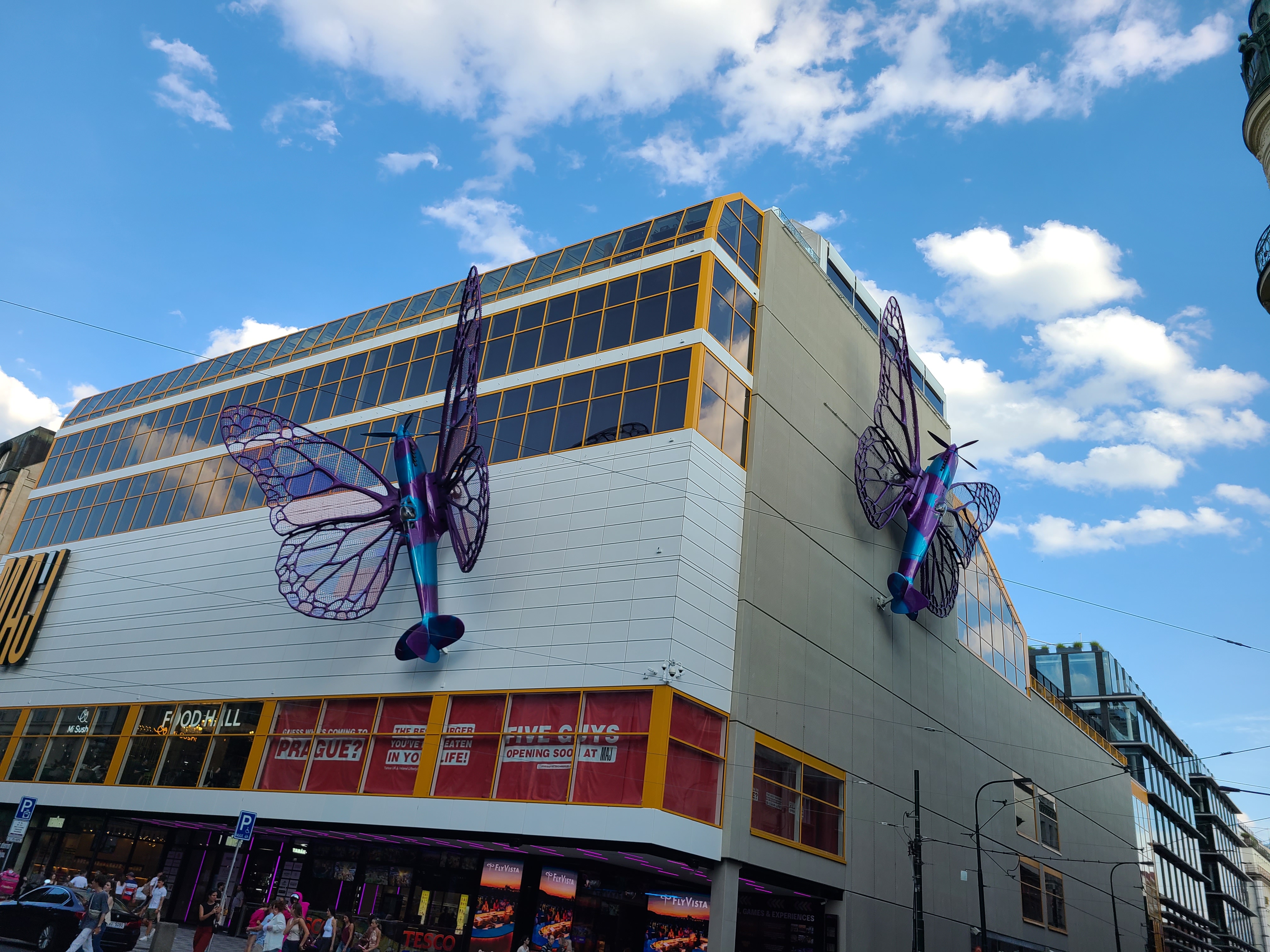 그날 유독 눈에 걸린 조형물이 하나 있었다. 비교적 현대식 건물 외벽에 설치된 나비와 비행기가 합쳐진 형상. 날개는 실제로 펄럭였고, 그 존재는 너무도 노골적이었다. 그때의 나는 그것을 예술 작품이라기보다, 중세 도시의 풍경을 배경 삼아 세워진 대형 쇼핑몰의 선전물로 받아들였다. 지금의 나는 그 조형물의 의미를 안다. 다비드 체르니의 작품으로, 스핏파이어 전투기를 닮은 몸체는 제2차 세계대전 당시 영국 공군과 육군에서 복무했던 체코슬로바키아 조종사들을 향한 헌사였다. 체코의 NATO 가입 25주년과 NATO 창립 70주년을 기념하며, 원래는 브뤼셀에 설치될 예정이었던 작품. 프라하에는 단 1년만 허락된, 잠시 머무는 존재였다. 내가 이 도시를 찾았을 때는 2025년 7월 초였다. 전시 기간은 이미 끝난 뒤였으니, 철거가 조금 늦어졌던 셈이다. 지금 생각하면, 그 조형물을 보았다는 사실보다도, 곧 사라질 것이라는 조건 속에서 마주쳤다는 점이 더 중요하게 느껴진다.